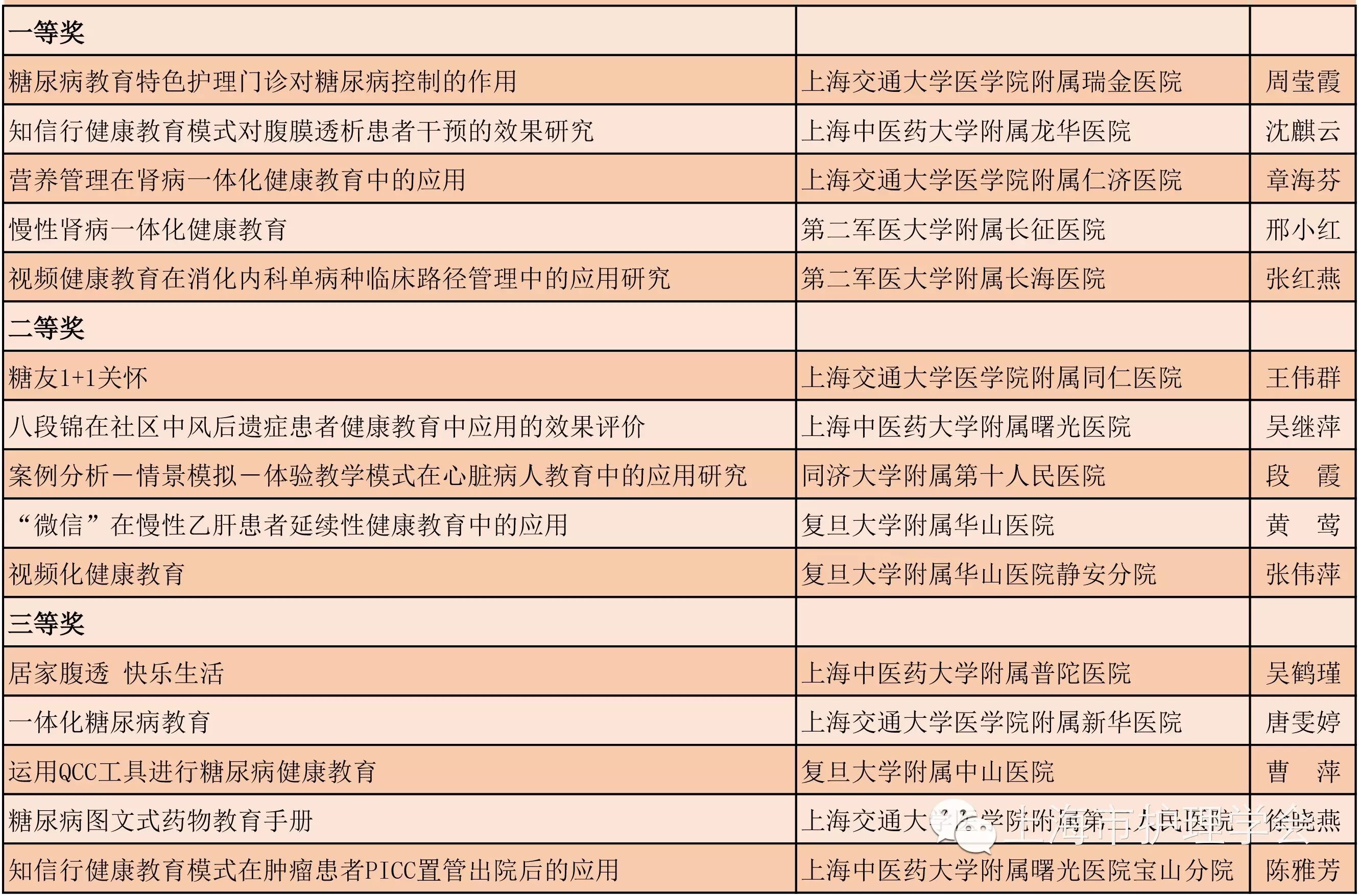 会上,副主任委员张佩雯汇报了2015年度内科护理专委会工作总结,主任委员施雁提出了2016年度内科护理专委会工作计划;公布了2015年上海市护理学会内科护理专业委员会健康教育论文评选结果并颁奖。通过对近50篇健康教育论文的初审、现场汇报及专家评审,最终遴选出一等奖、二等奖和三等奖各5篇,具体名单如下。
