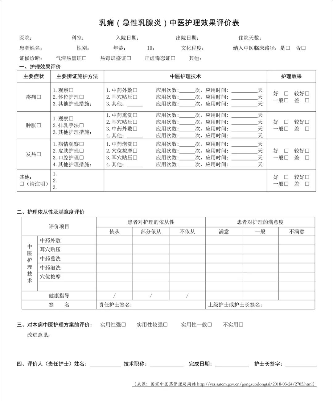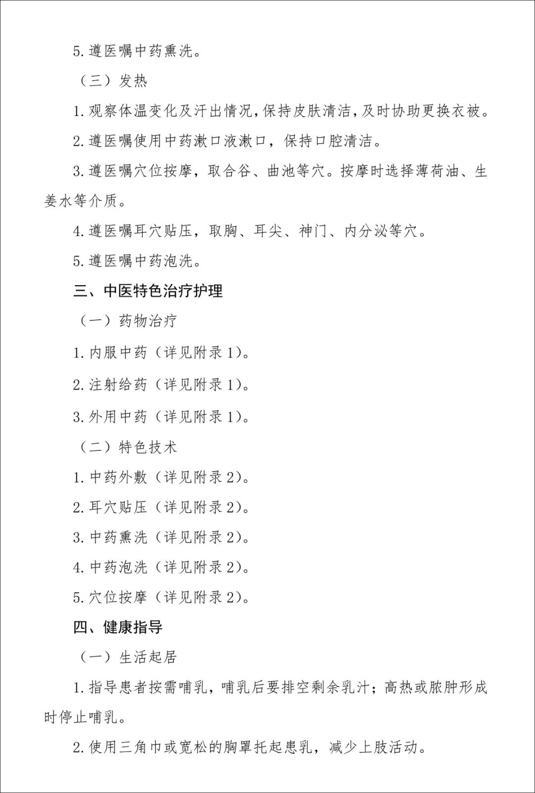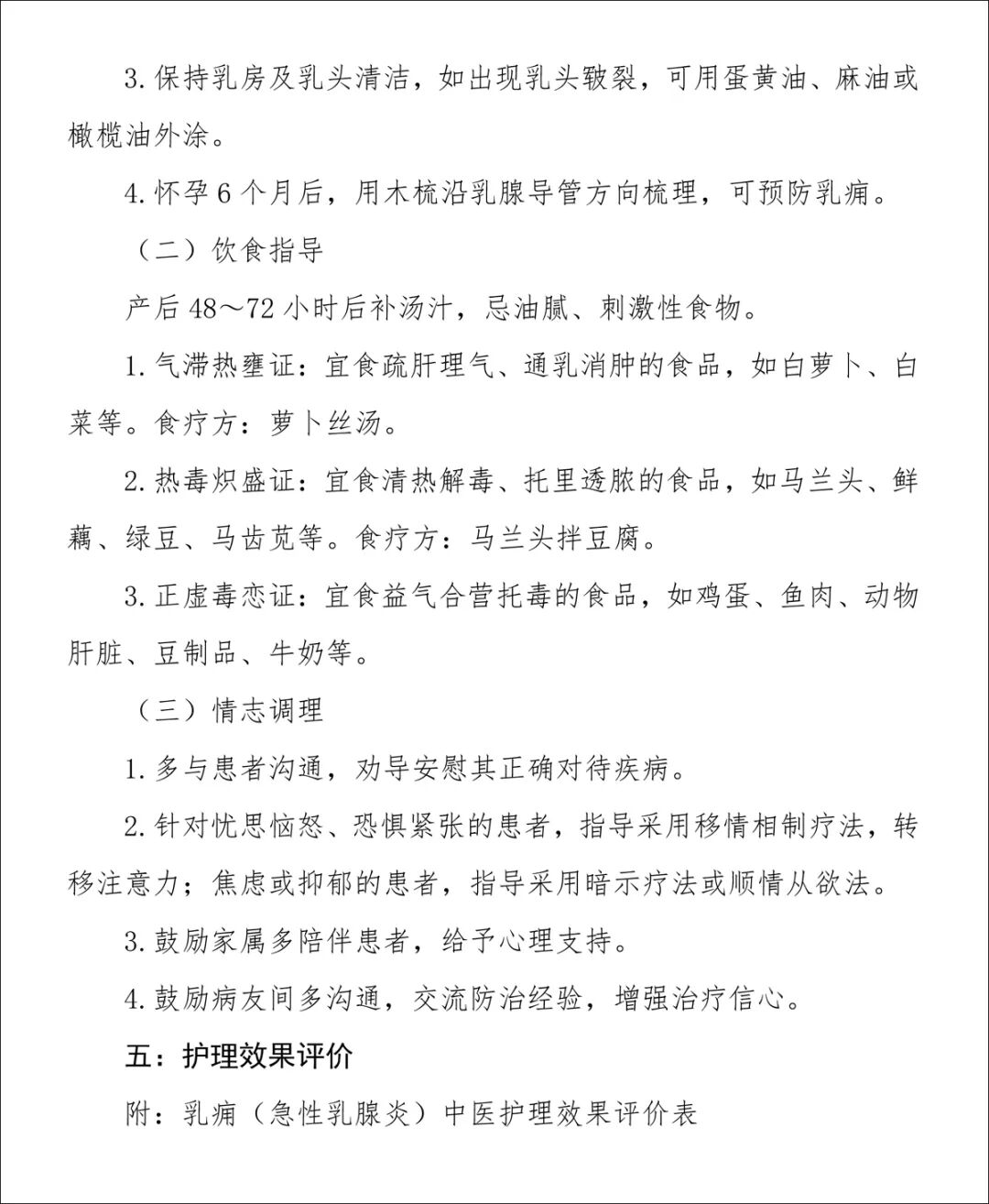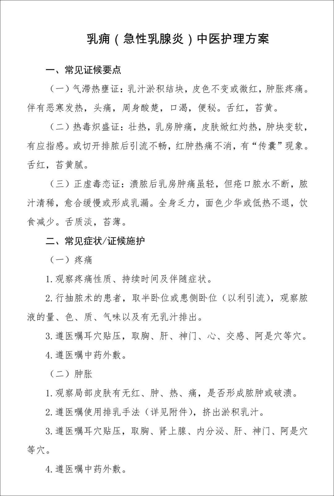 2015 年国家中医药管理局颁布了《乳痈中医护理方案》。该方案主要包括5部分内容:常见证候要点、常见症状及辨证施护、中医特色治疗护理、健康指导以及护理效果评价表。