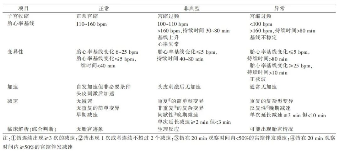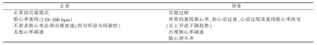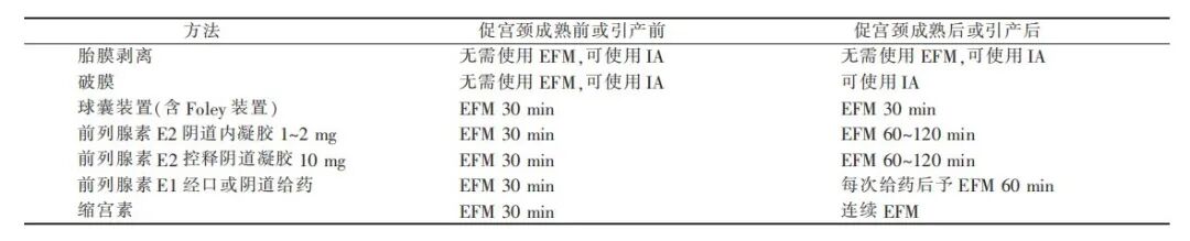 4.3 促宫颈成熟和引产产妇的FHS ①使用前列腺素制剂促宫颈成熟前30 min需要进行连续EFM,以确认胎儿是否处于正常状态;使用前列腺素制剂后需要继续进行连续EFM 1~2 h评估胎儿健康状况……见表6。