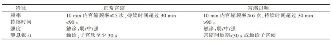 2.2.2 评估内容 ①频率。评估10 min内子宫收缩的次数,平均每次观察30 min,以判断有无宫缩过频。②持续时间……见表3。