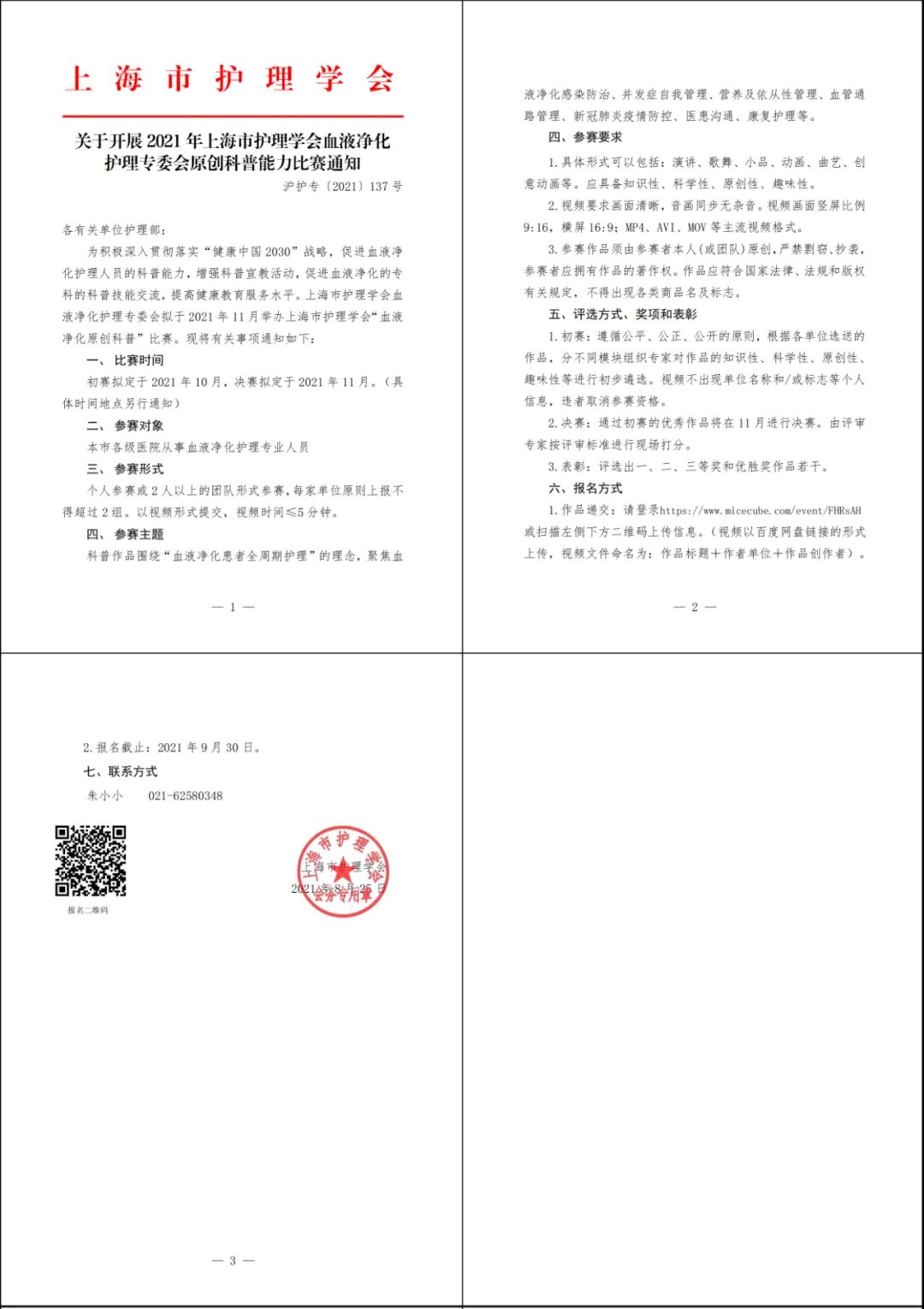 为积极深入贯彻落实“健康中国2030”战略,促进血液净化护理人员的科普能力,增强科普宣教活动,促进血液净化的专科的科普技能交流,提高健康教育服务水平。上海市护理学会血液净化护理专委会拟于2021年11月举办上海市护理学会“血液净化原创科普”比赛。