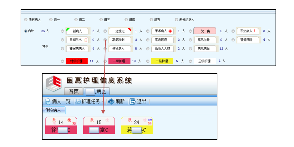 图1 护士工作站信息系统患者一览表第一功能区截图
