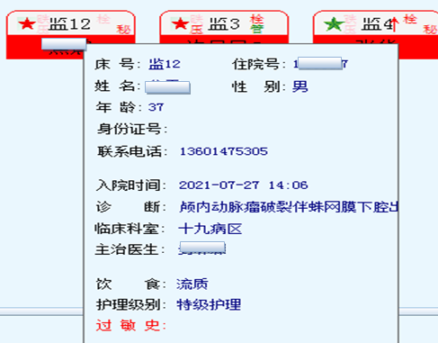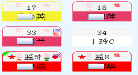 1.1 第一功能区(患者的基本信息区) 患者基本信息区域静息状态下只显示患者的床号、姓名。每个床位显示区域分为上、下两部分的长方形,上层为床号、底色为白色,下层为患者姓名、根据医嘱护理级别显示不同底色(特级护理:鲜红色;一级护理:玫红色;二级护理:黄色;三级护理:白色)。当鼠标移至该床位时,患者的住院号、年龄、性别、诊断、联系方式、管床医师、护理级别、饮食、过敏史等信息会在新弹出的窗口显示,方便医护人员迅速了解患者基本病情,当鼠标移走时则弹出窗口消失。见图1。