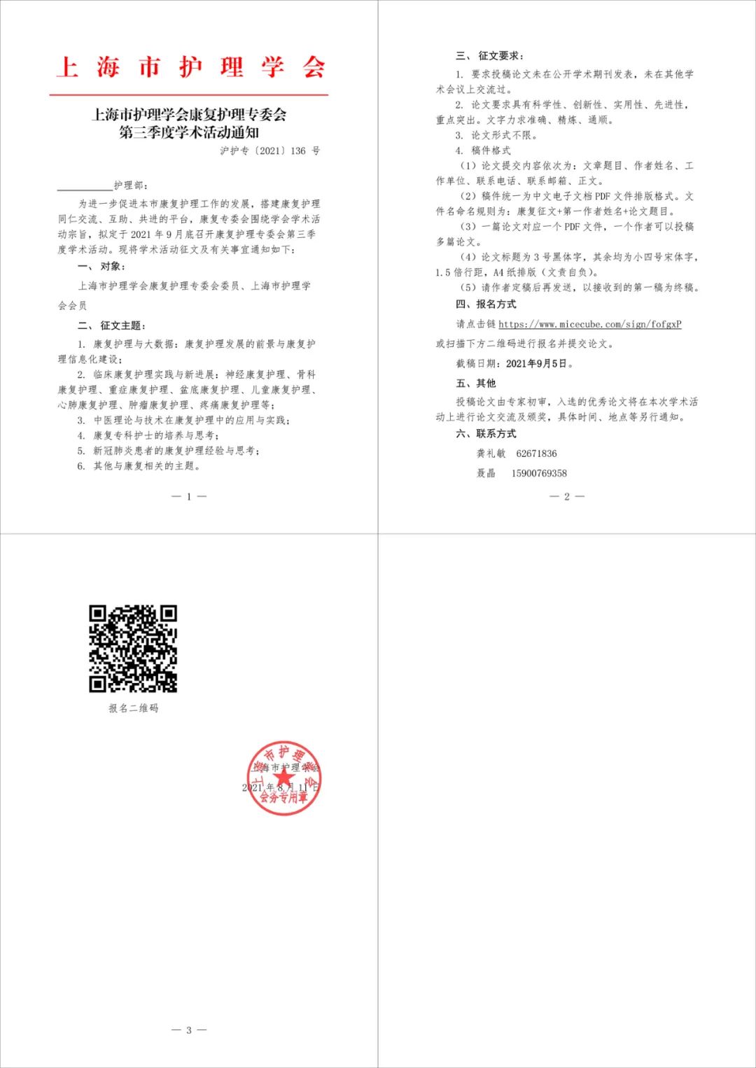 为进一步促进上海地区康复护理工作的发展,搭建康复护理人员交流、互助、共进的平台,围绕学术活动宗旨,上海市护理学会康复护理专委会将于近期举办康复护理征文活动。