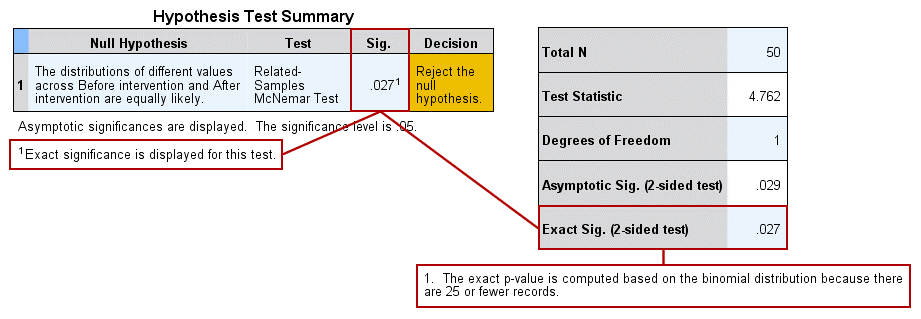 Hypothesis Test Summary表的注释1说明了根据二项式分布用精确法得到P值。可以看到,Hypothesis Test Summary表“Sig.”一列的值,与右侧表中的“Exact Sig. (2-sided test)”的值相等。