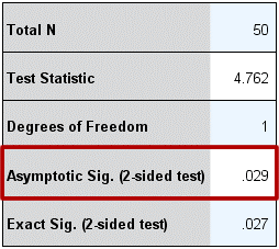 输出结果的表格中,“Exact Sig. (2-sided test)”一行的P值为0.027,“Asymptotic Sig. (2-sided test)”一行的近似P值为0.029。(如果左下和右上格子相加的观测数大于25,不展示精确P值,只展示近似P值,此时Hypothesis Test Summary表中结果也是近似P值)。